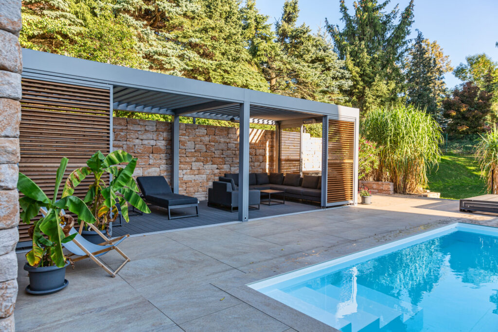 Die sogenannte Loggia Privacy Wood schafft durch die Kombination aus kühler, moderner Dachkonstruktion und warmen Holzelementen in der Seitenfüllung eine außergewöhnlich angenehme Atmosphäre. Je nach Sonnenstand und gewünschter Privatsphäre lassen sich die Holzlamellen flexibel einstellen und sorgen so für ein ausgewogenes Spiel aus Licht, Schatten und Offenheit.