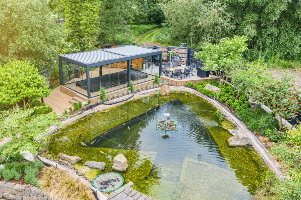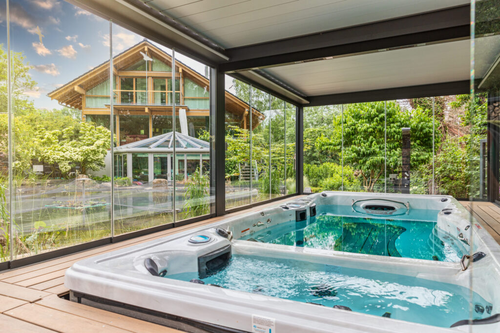 So entsteht ein moderner Spa-Bereich, der nicht nur durch Design, sondern vor allem durch technische Raffinesse überzeugt und eine flexible, wetterunabhängige Nutzung ermöglicht. Die Umgestaltung der umliegenden Terrasse sowie des großzügigen Teichbereichs wurde perfekt in das Gesamtkonzept integriert und rundet das Projekt stimmig ab.