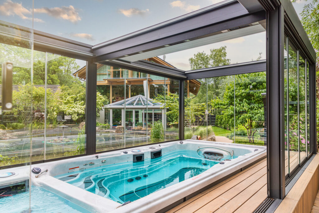 In Sachsen-Anhalt wurde eine außergewöhnliche Lamellenüberdachung realisiert, die dem Anspruch „dem Himmel so nah“ mehr als gerecht wird. Ziel des Projekts war es, einen bestehenden Schwimmspa deutlich länger im Jahr nutzbar zu machen und das aufwendige Abdecken mit einer sperrigen Schutzhaube auf ein Minimum zu reduzieren.