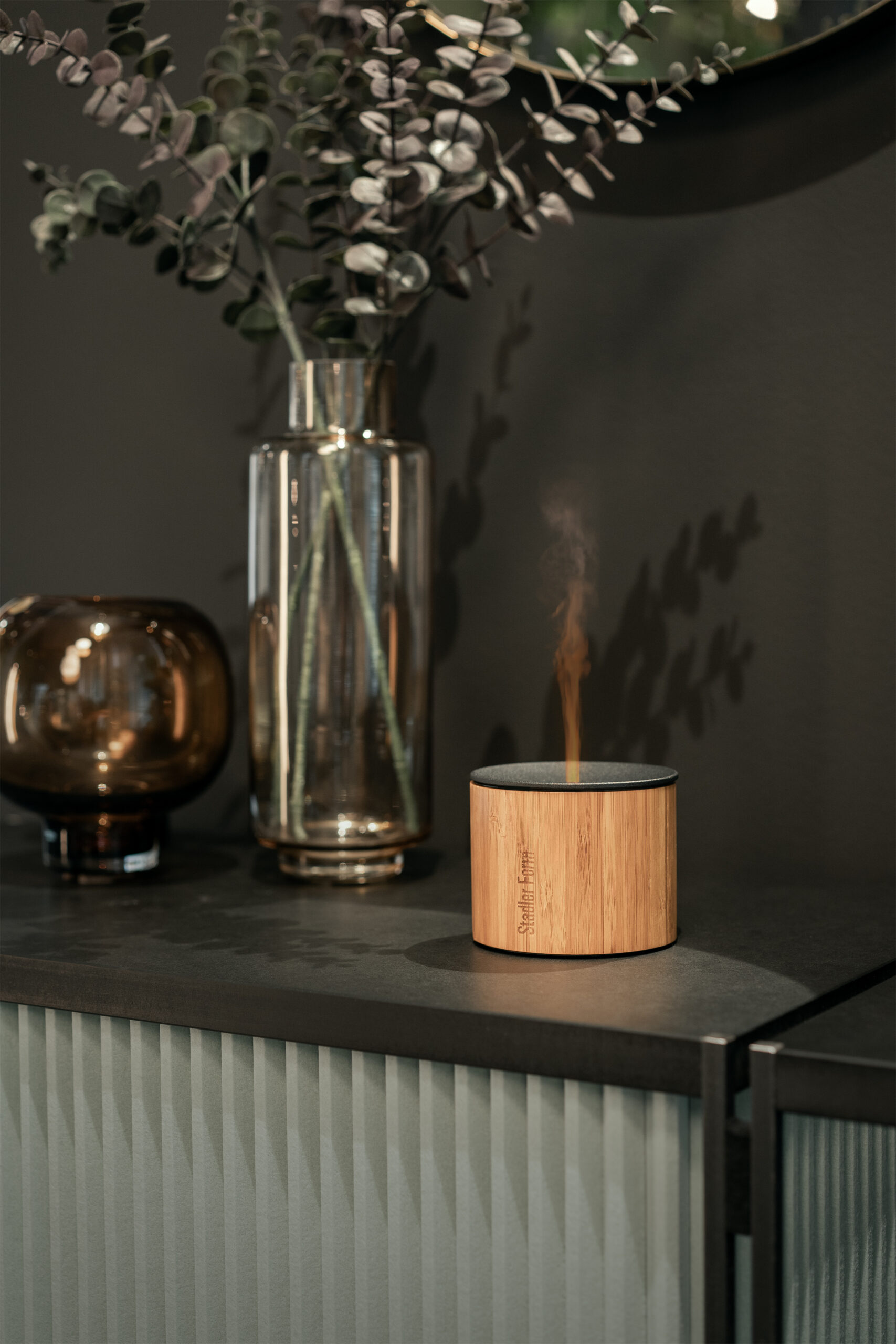 Nora verteilt Düfte ganz ohne Strom und Wasser: Ein kleiner Ventilator bläst Luft über die mit Duftöl gefüllten Perlen, und der Duft verströmt dezent im Raum. Das handgefertigte Bambus-Gehäuse macht sie gleichzeitig zum stilvollen Deko-Objekt.